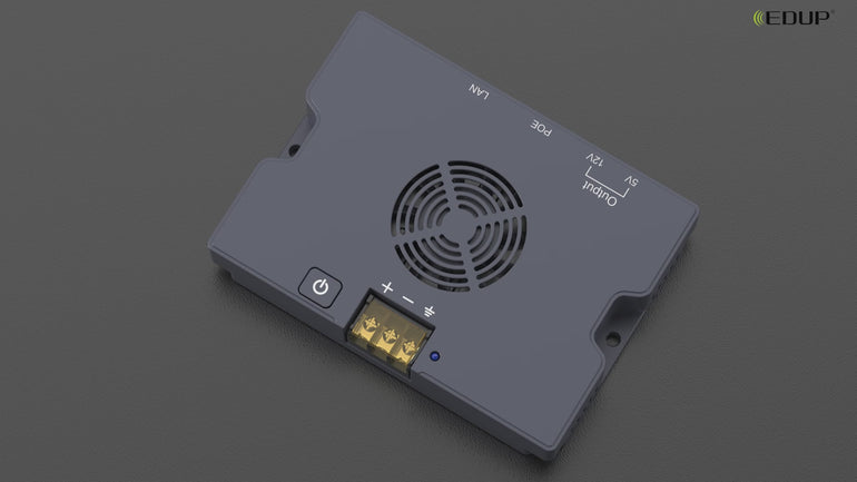 An integrated smart fan automatically regulates internal temperature, keeping the unit cool under heavy loads or harsh conditions from -30°C to +75°C. Whether you're in a desert, a mountaintop, or on the road — this PoE injector is built to last.